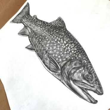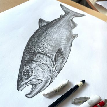 Detailed pencil drawing of a fish on white paper.