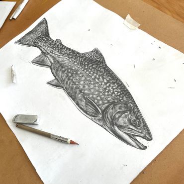Detailed pencil sketch of a fish on white paper.